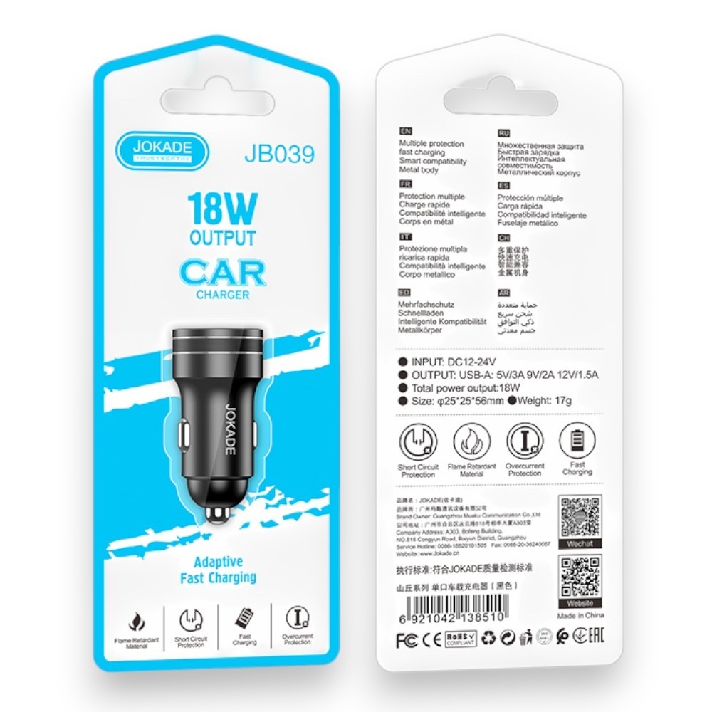 Автомобільні зарядні пристрої | Придбати АЗП Jokade JH039 Single port QC3.0 Black для по ціні 155 грн - доставка по Україні