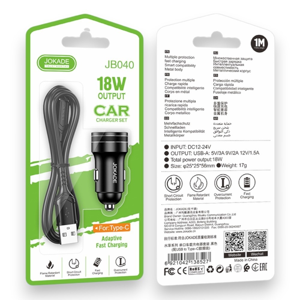 Автомобільні зарядні пристрої | Придбати АЗП Jokade JH040 Single port QC3.0 Type-C Black для по ціні 176 грн - доставка по Україні