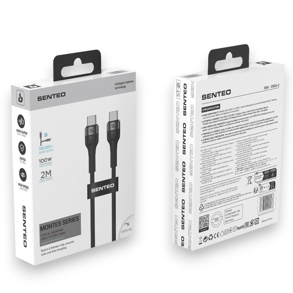 USB cable Senteo Montes Series 100W Type-C to Type-C — це кабель нового покоління, розрахований на високу потужність та стабільну роботу з сучасними пристроями. Він підходить не лише для смартфонів, а й для ноутбуків, планшетів, зарядних станцій і павербанків з підтримкою Type-C.