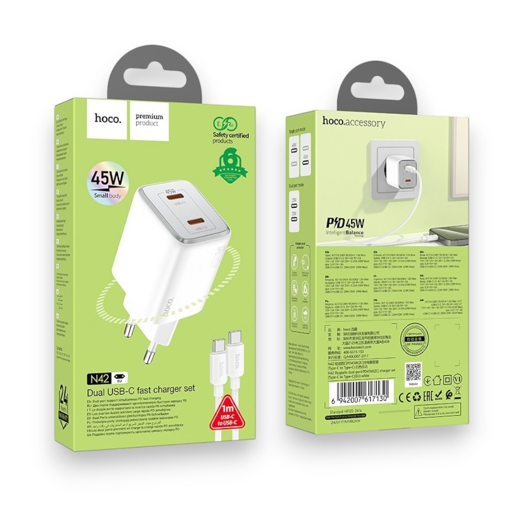 Зарядні пристрої | Придбати Мережевий зарядний пристрій Hoco N42 PD45W (2 USB-C) withType-C cable White для по ціні 724 грн - доставка по Україні
