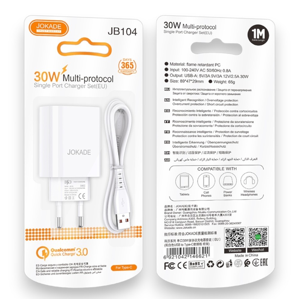 Зарядні пристрої | Придбати МЗП Jokade JB104 Single port 30W Type-C White для по ціні 214 грн - доставка по Україні