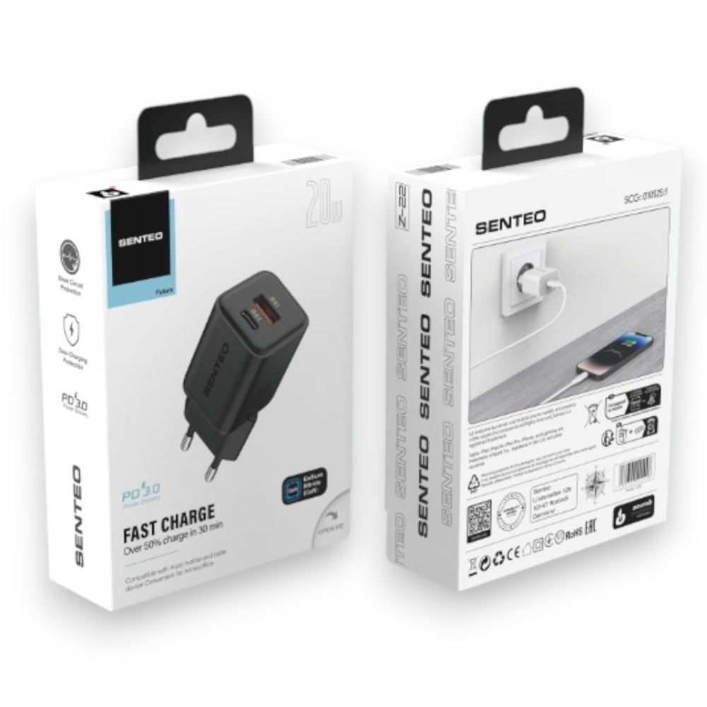 Senteo Z-22 - це компактний мережевий зарядний пристрій з технологією GaN, який поєднує два порти (USB + USB-C) та підтримку швидкої зарядки Power Delivery 20W. Оптимальний варіант для щоденного використання вдома, в офісі або в поїздках.